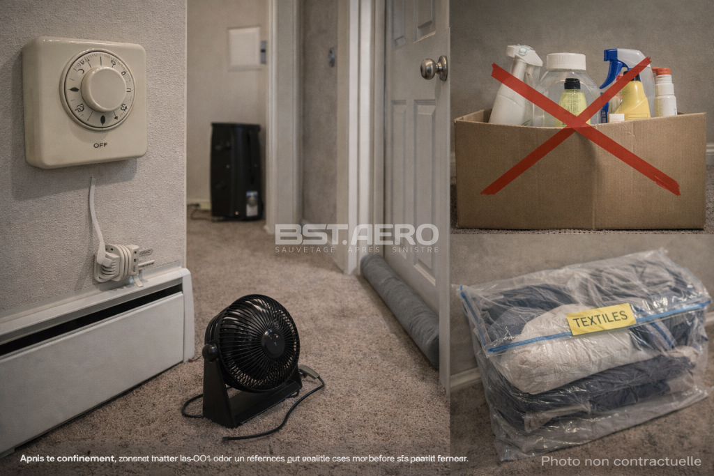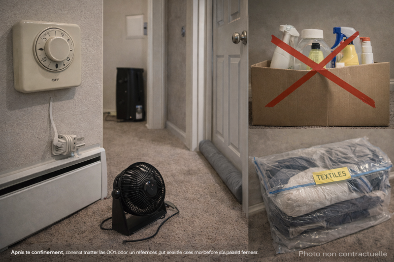 Certains textiles ou objets posés au sol peuvent être déplacés temporairement pour limiter la diffusion de l’odeur.