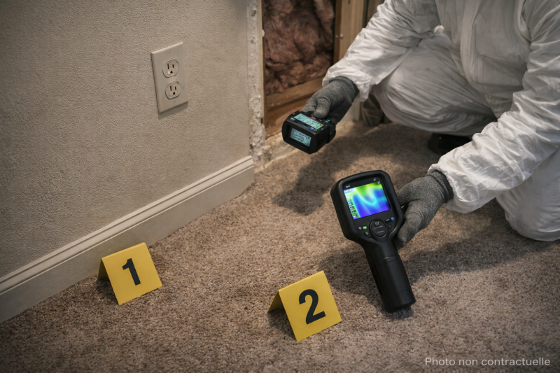 Une odeur localisée au sol, près des plinthes, dans un angle ou derrière un doublage indique souvent un “réservoir” odorant, même sans trace visible.