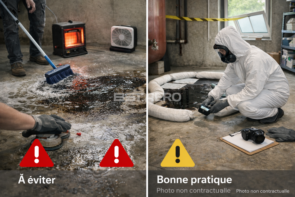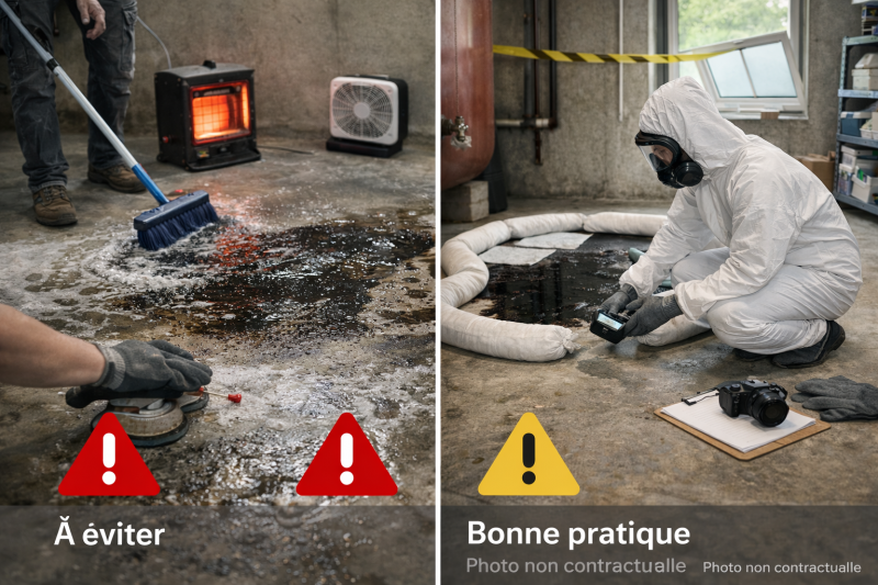Les réflexes “rapides” aggravent souvent la situation : lavage abondant, chauffage forcé, ponçage, aération non ciblée.
